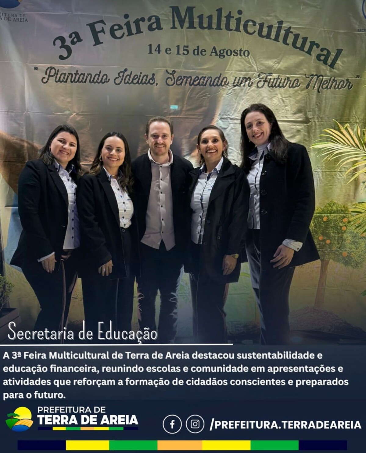 A 3ª Feira Multicultural de Terra de Areia, com o tema "Plantando Ideias, Semeando um Futuro Melhor", foi realizada com grande sucesso pela Secretaria Municipal de Educação e pela administração municipal. O evento buscou estimular a reflexão sobre o papel de cada cidadão na construção de uma sociedade mais consciente, com destaque para a sustentabilidade e a educação financeira.