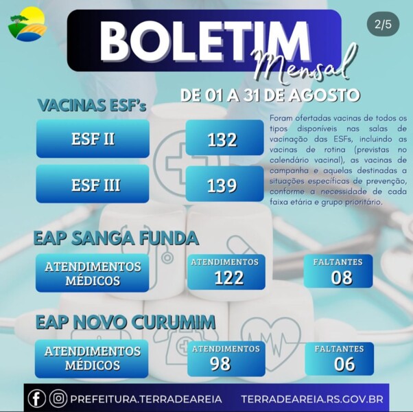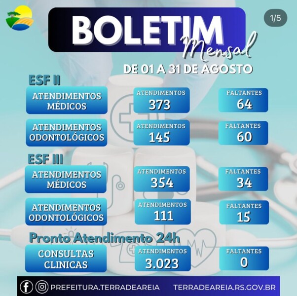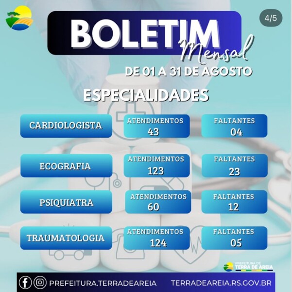 A Secretaria de Saúde de Terra de Areia apresenta o Boletim Mensal de Atendimentos - agosto/2025.