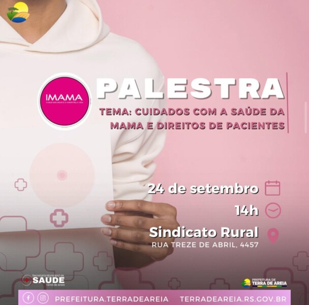 A Prefeitura de Terra de Areia, através da Secretaria de Saúde, convida para a palestra sobre cuidados com a saúde da mama e direitos de pacientes, em parceria com o IMAMA.