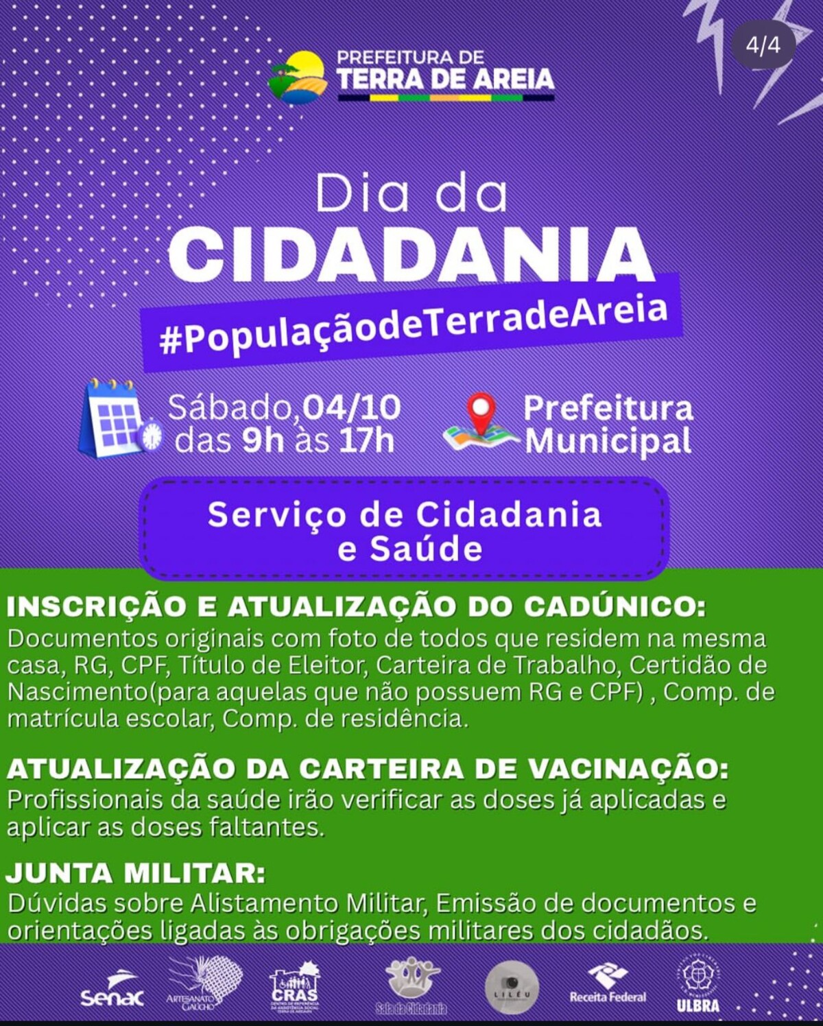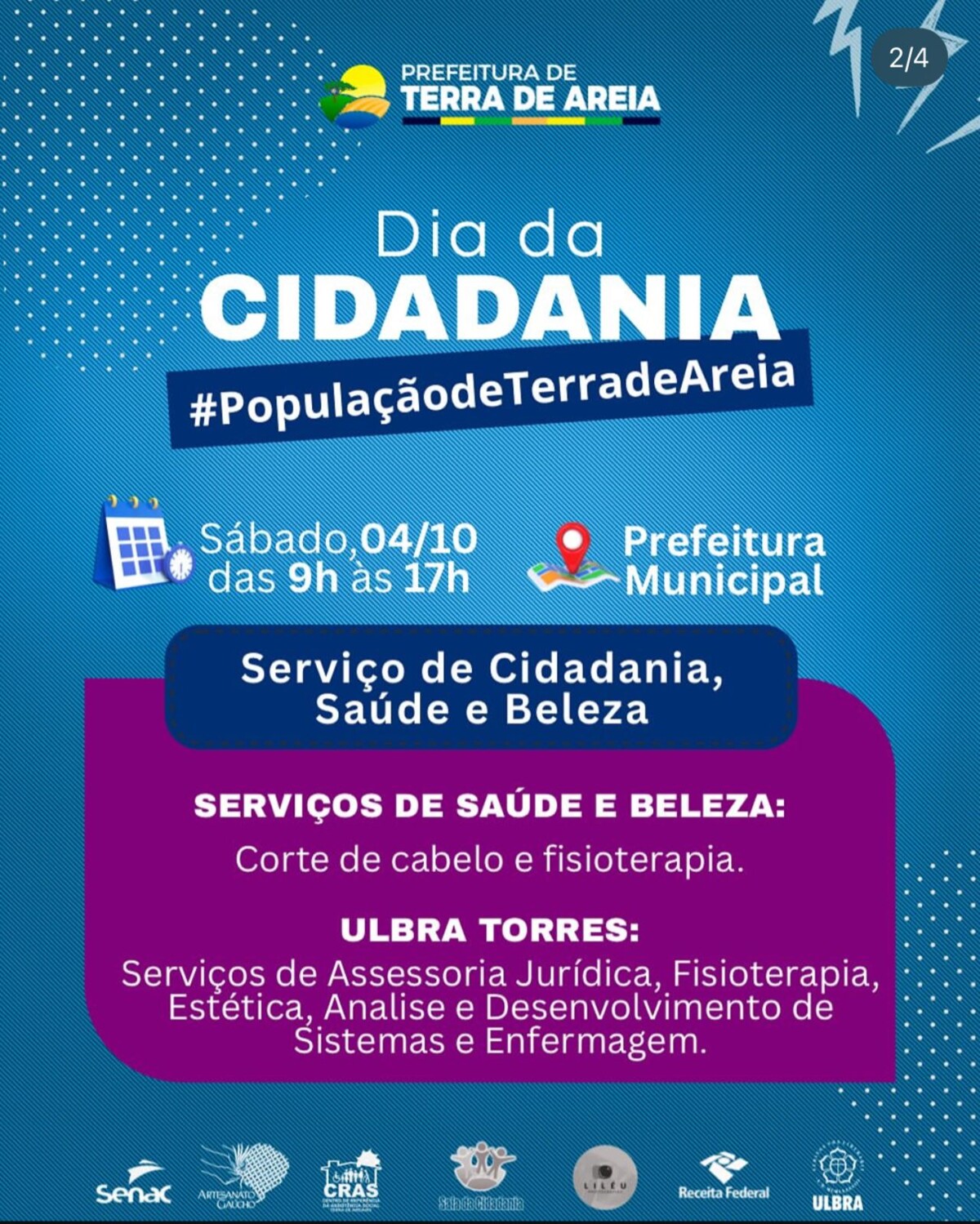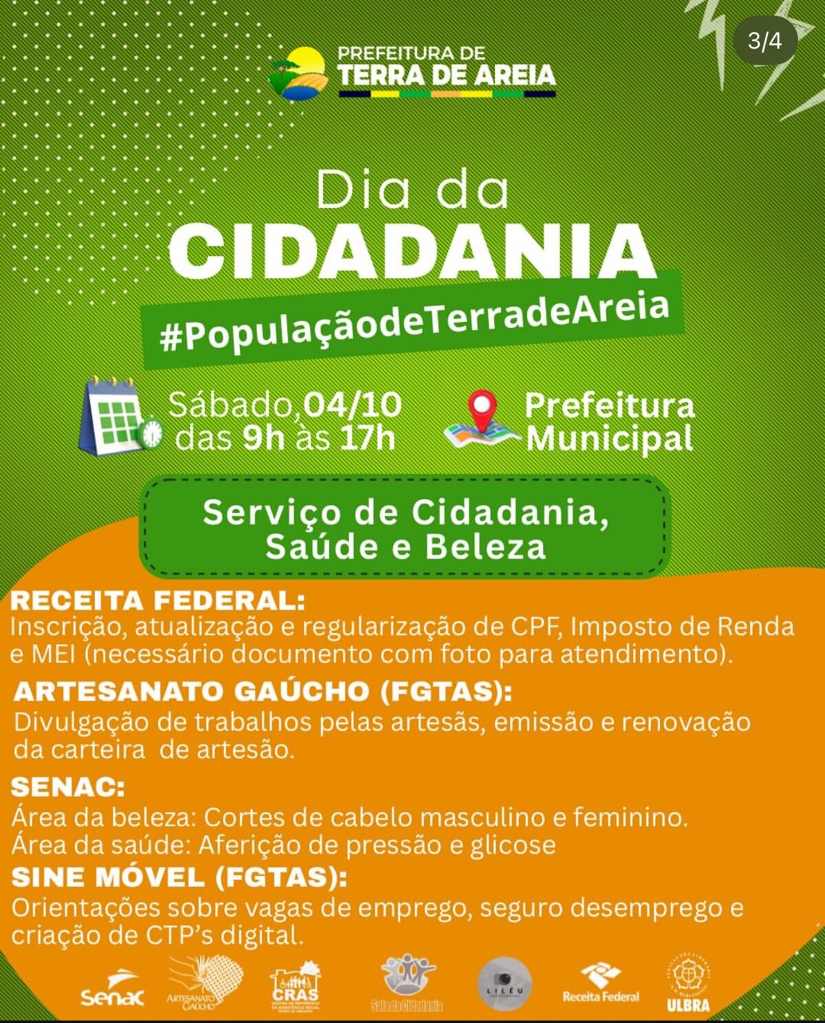 No próximo sábado, 04/10, das 9h às 17h, acontece o Dia da Cidadania na Prefeitura Municipal de Terra de Areia.