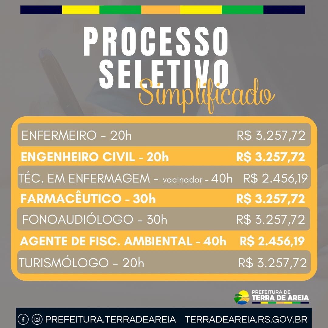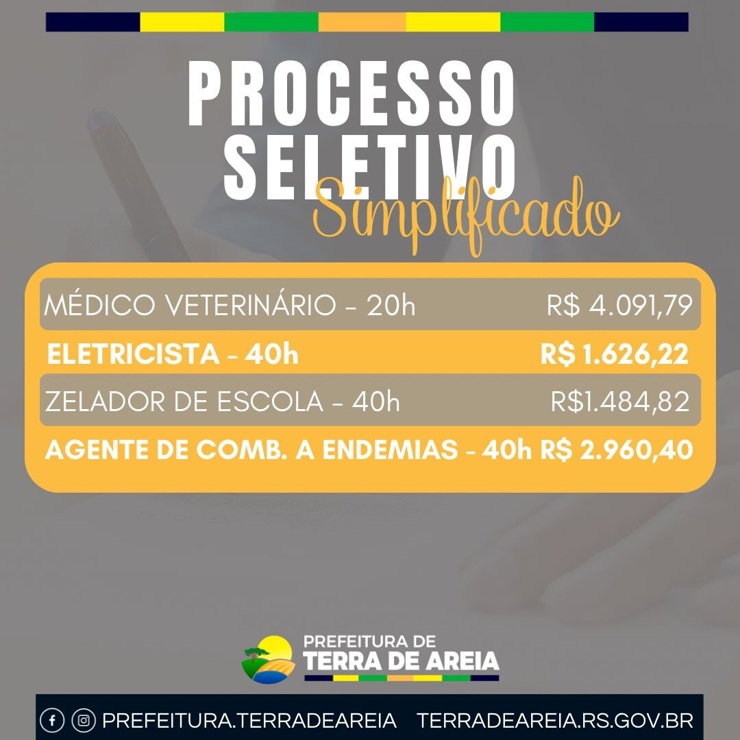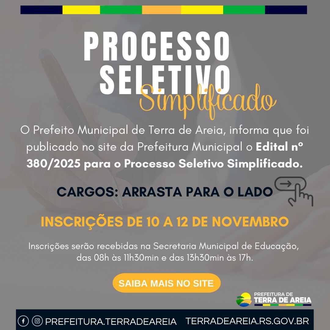 A Prefeitura de Terra de Areia informa que está aberto o Processo Seletivo Simplificado, conforme o Edital nº 380/2025.