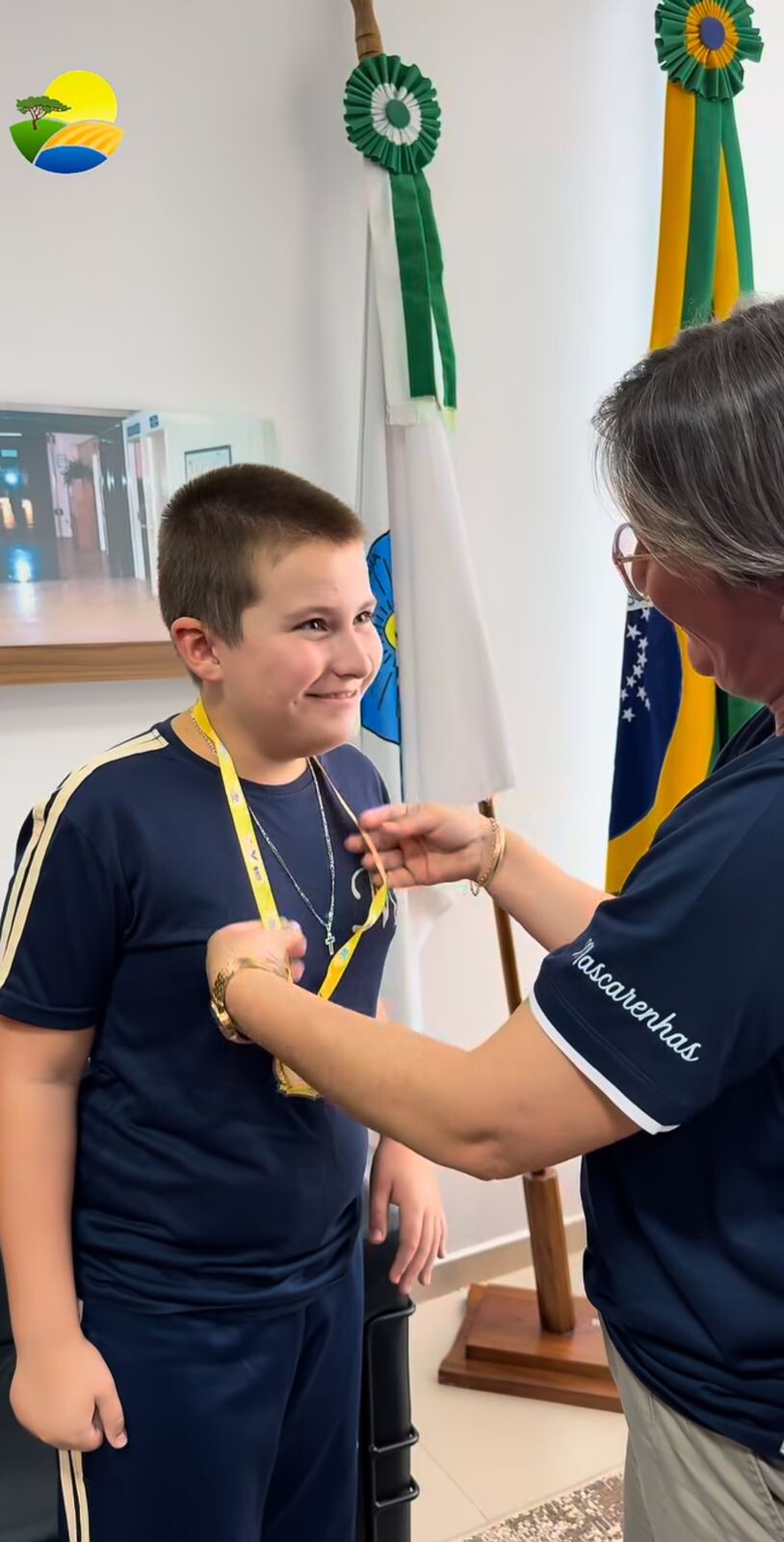 A solenidade de entrega da medalha ao aluno Enzo contou com a presença do Prefeito Osvaldo, da Secretária de Educação Josieli, de demais secretários municipais, da Diretora Janaína e da mãe do estudante, Sra. Josiane