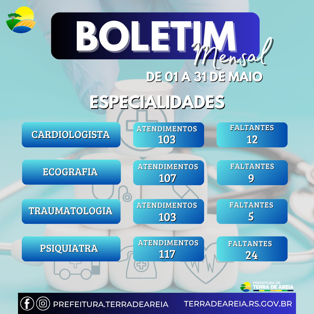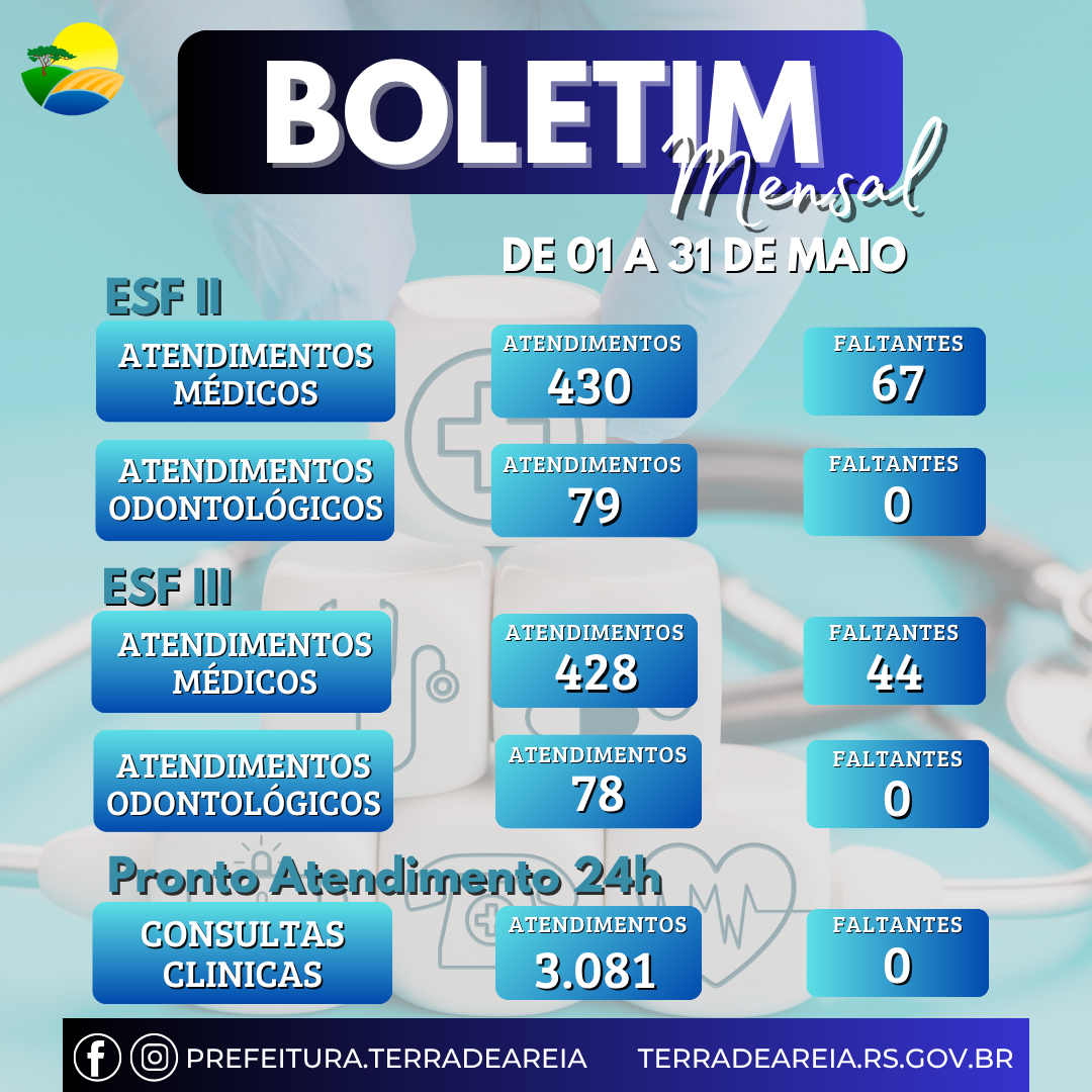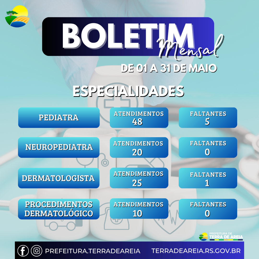A Prefeitura de Terra de Areia divulga o resumo das ações realizadas entre os dias 01 e 31 de maio, contemplando atendimentos médicos, odontológicos e especialidades. O boletim reforça o compromisso com a saúde da população, apresentando um panorama das consultas realizadas e o acompanhamento dos atendimentos nas unidades de saúde e pronto atendimento 24h. 💙🏥