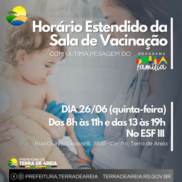 No dia 26 de junho (quinta-feira), a Sala de Vacinação do ESF Ill estará com horário estendido, das 8h às 11h e das 13h às 19h, para facilitar o atendimento da comunidade.