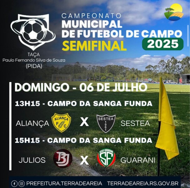 Neste domingo, dia 06 de julho, acontecem as partidas da semifinal do Campeonato Municipal de Futebol de Campo 2025 - Taça Paulo Fernando Silva de Souza (PIDA)!