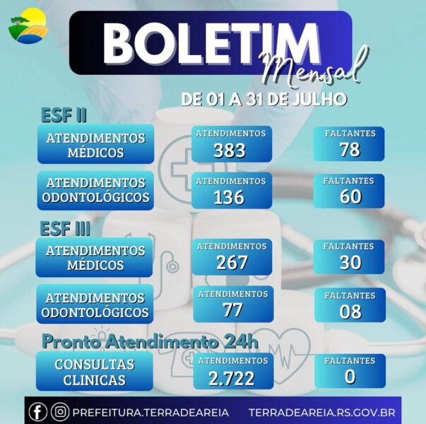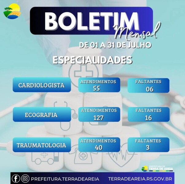 A Prefeitura de Terra de Areia apresenta os dados de atendimentos, exames, especialidades e vacinação realizados entre 01 e 31 de julho nas unidades de saúde do município.