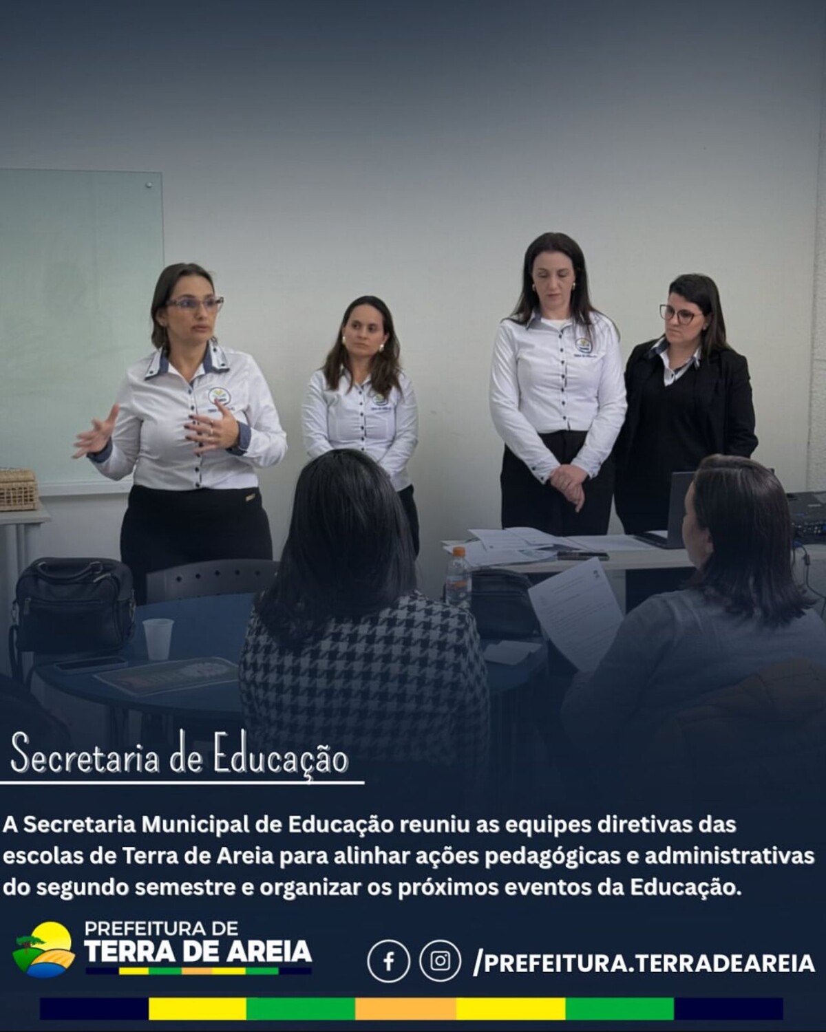 Na tarde desta terça-feira, 26 de agosto, a Secretaria Municipal de Educação promoveu uma reunião de alinhamento com as equipes diretivas das escolas de Terra de Areia. O encontro, realizado juntamente com a equipe técnica e pedagógica da secretaria, teve como objetivo fortalecer a gestão escolar e alinhar as ações pedagógicas e administrativas para o segundo semestre letivo.