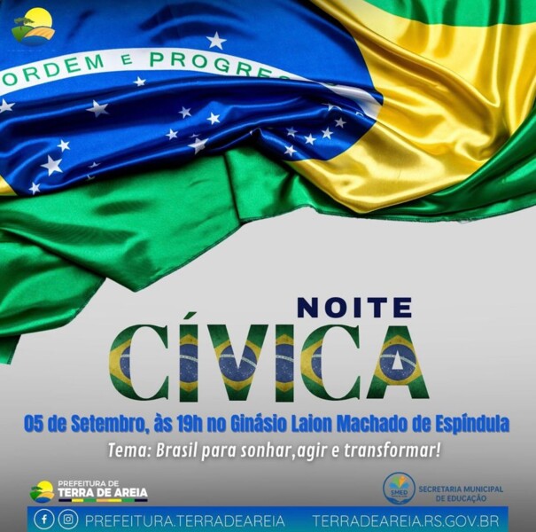 A Prefeitura de Terra de Areia, através da Secretaria Municipal de Educação, convida a comunidade para prestigiar a Noite Cívica, que acontece no dia 05 de setembro, às 19h, no Ginásio Laion Machado de Espíndula.