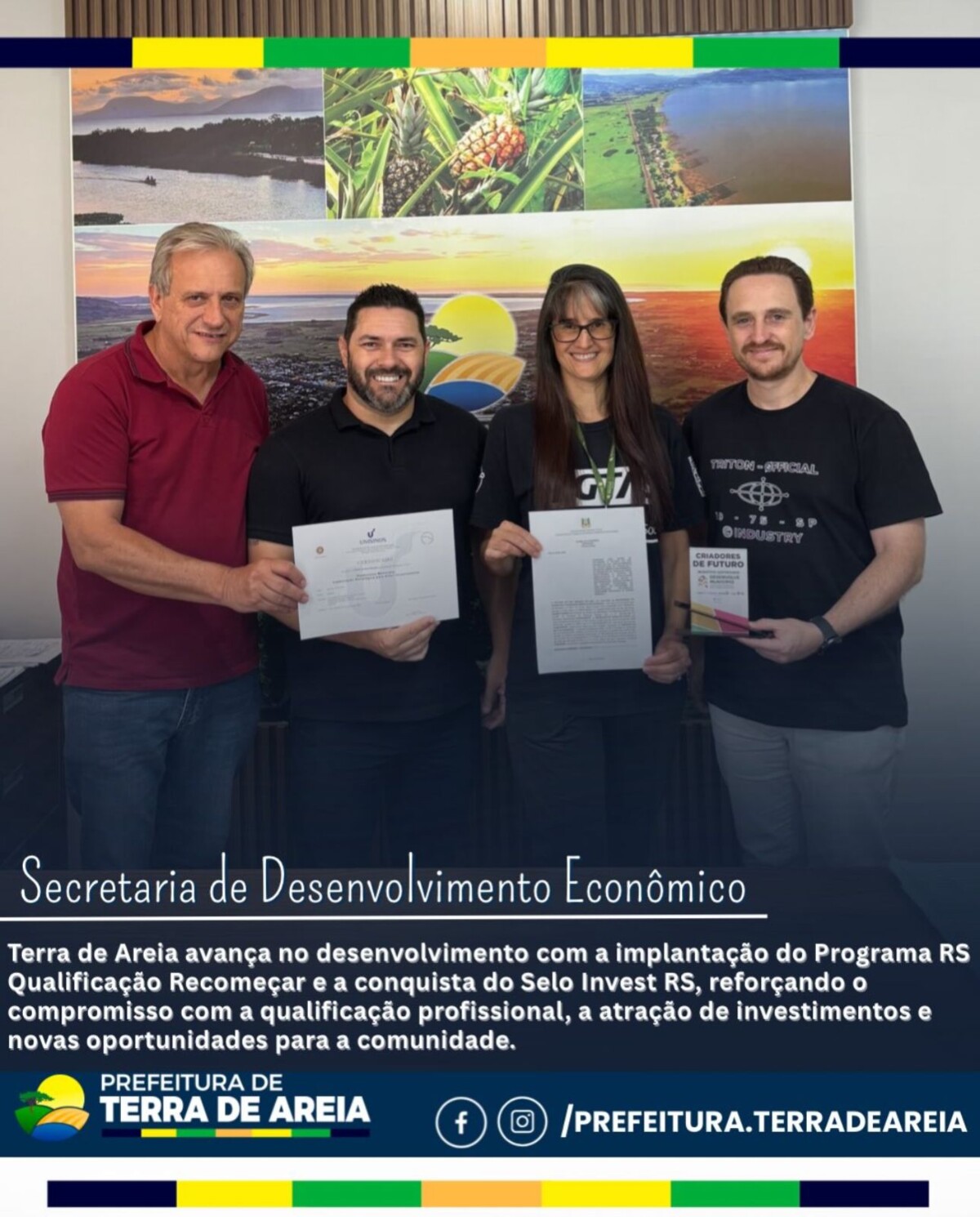 No dia 04/12, Terra de Areia recebeu o Selo Invest RS, durante a solenidade do programa Desenvolve Município, realizada na FAMURS, em Porto Alegre. O Prefeito Osvaldo Matos recebeu a certificação, que reconhece o avanço das ações voltadas ao desenvolvimento econômico e à melhoria do ambiente de negócios.