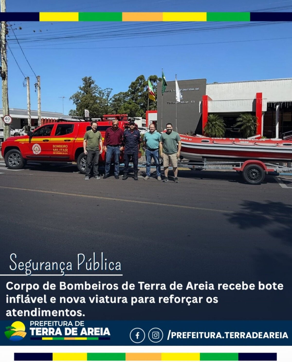 O Corpo de Bombeiros de Terra de Areia recebeu um bote inflável Flexboat SR15, equipado com motor de 50hp, além de uma viatura L200 Triton, ampliando a capacidade de atendimento e resposta em ocorrências, especialmente em áreas alagadas e operações de salvamento.
