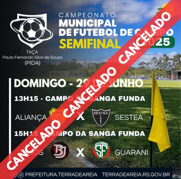 As partidas da semifinal do Campeonato Municipal de Futebol de Campo 2025, que aconteceriam neste domingo, 29 de junho, no Campo da Sanga Funda, foram CANCELADAS devido às fortes chuvas e às condições climáticas adversas.